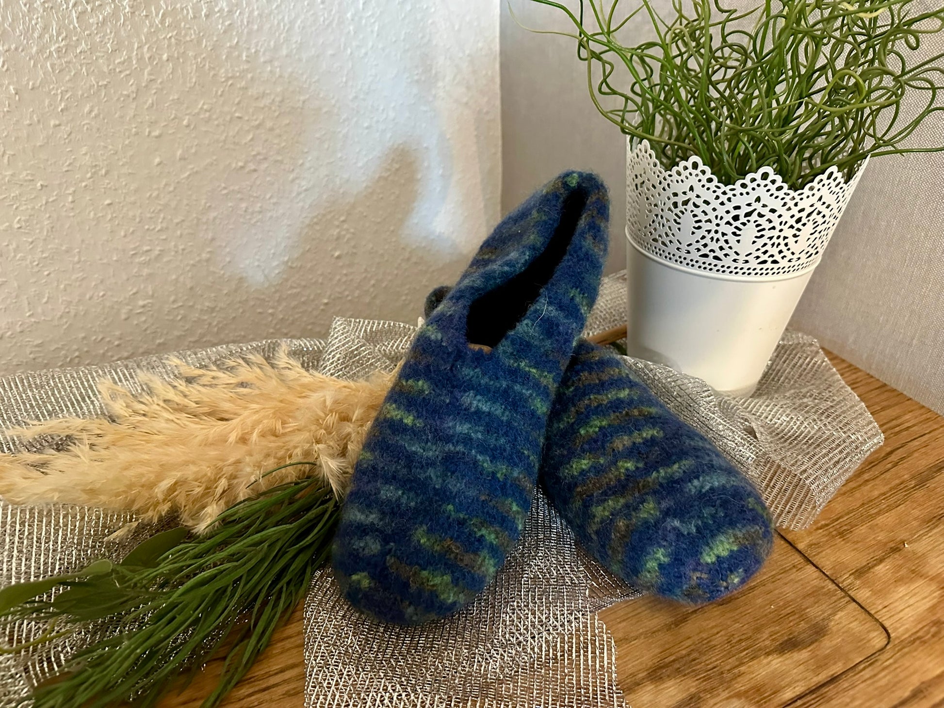 Filzpuschen in dunkelblau grün meliert in den Größen 36-48