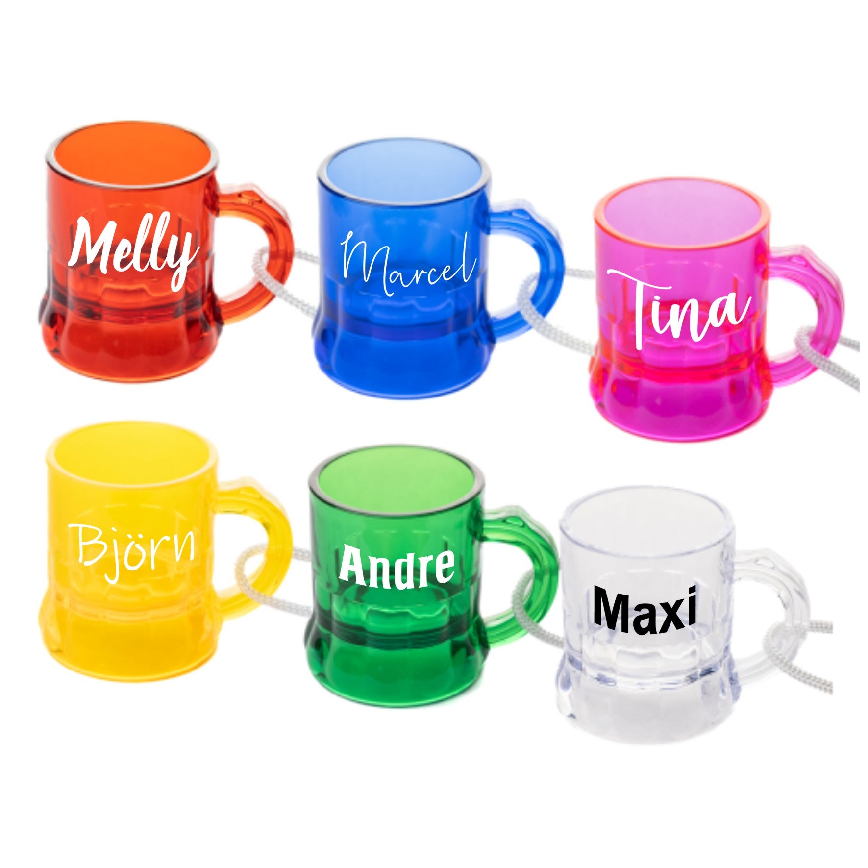 Personalisierte Schnapsgläser Kunststoff in 6 Farben inkl Umhängeband